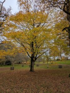 On our way to Bethlehem Wood we passed and admired a statuesque Caucasian Wingnut Tree ( Pterocarya pterocarpa) which had just dropped its beautiful yellow leaves in the recent winds. The wood itself contains a significant collection of 30 Birch varieties, including a number from Japan and China. These trees were fascinating not only for their different size and shape, but for their wonderfully coloured bark. One particularly eye-catching example (amongst a number of others) was the Erman’s Birch ( Betula ermanii) with peeling pink-grey bark. Other birches had so much dangling bark they resembled a mummy losing its bindings . We also admired the Chinese Elm (Ulmus parvifolia), which, unusually, bears flowers in the Autumn and whose bark is exquisitiely textured and coloured such that – to my eye – it could have been created by an impressionist painter.